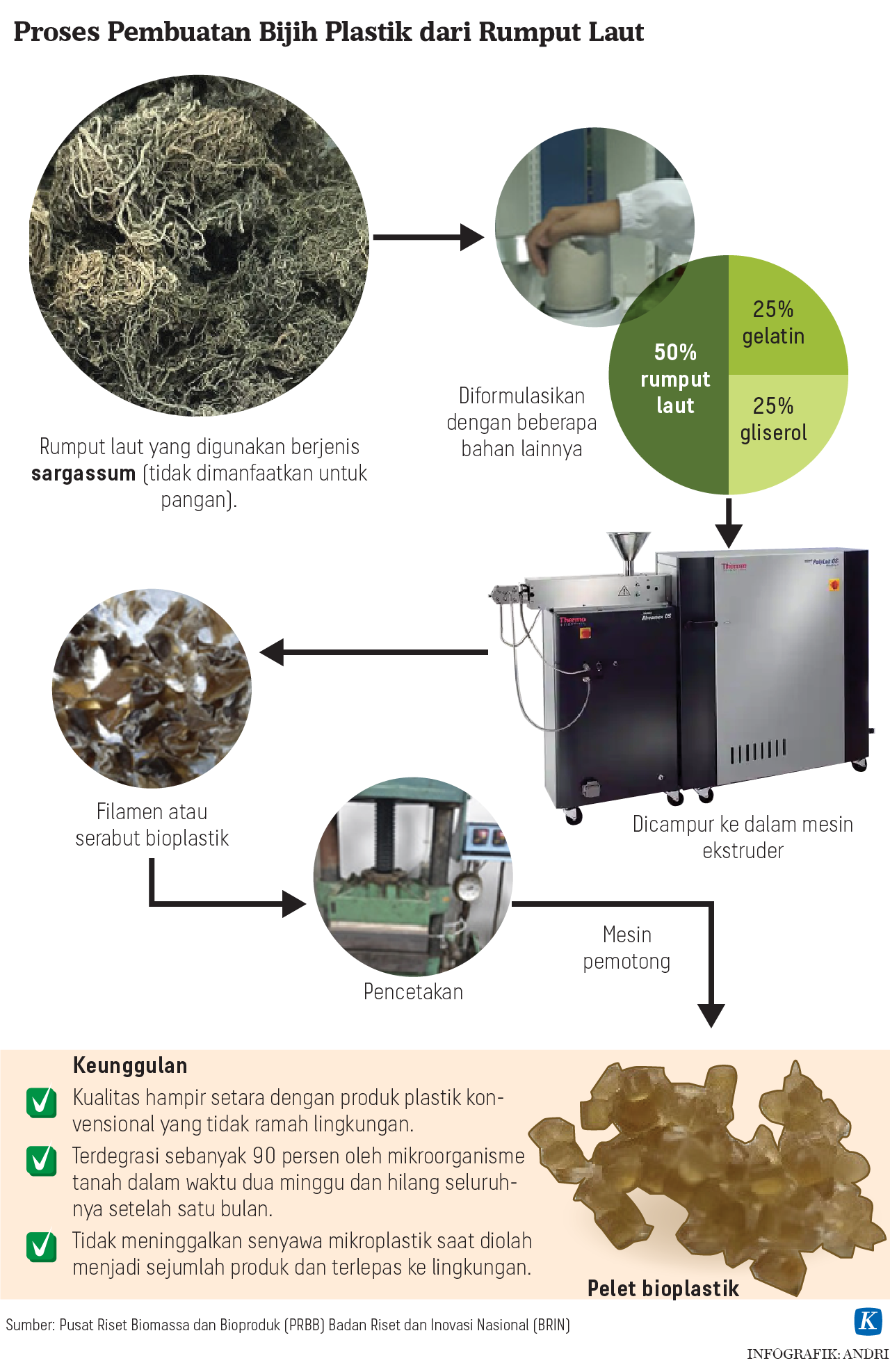 Rumput laut dengan beragam jenis telah banyak diteliti dan dikembangkan menjadi berbagai macam produk. Produk tersebut mulai dari agar-agar, minuman fungsional, hingga bioplastik.
