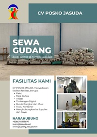 CV POSKO JASUDA menyediakan jasa layanan dalam hal Sewa Gudang untuk penyimpanan Rumput Laut. Lokasi Gudang berada di Pergudangan 88, Pattene, Kota Makassar, Provinsi Sulawesi Selatan.